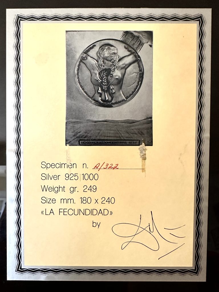 Called La Fecundidad or Fertility, it’s a sterling silver relief from 1977. It’s signed by the Spanish surrealist, weighs just 249 grams, and measures 18 by 24 centimetres.